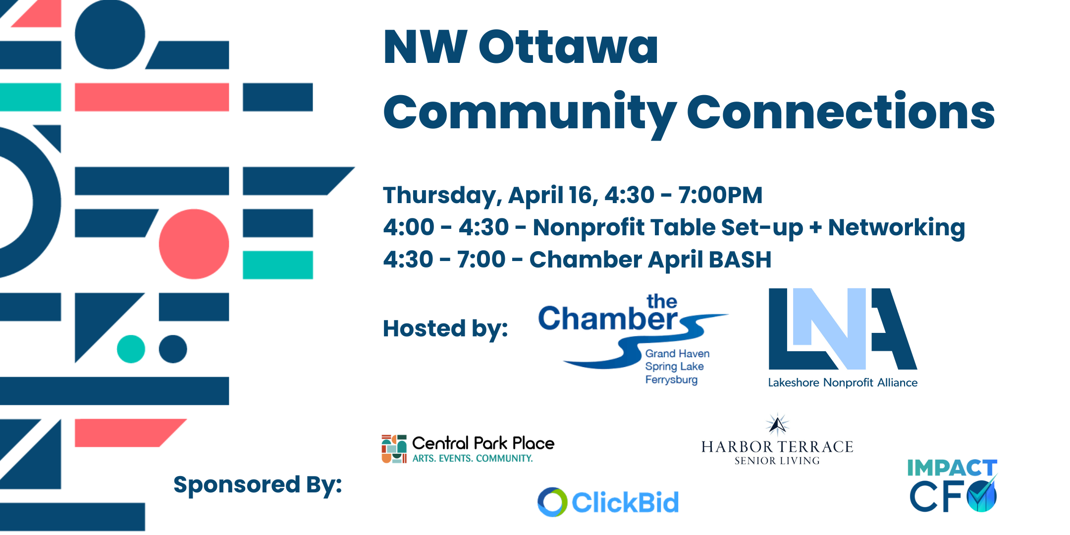 Are you looking for ways to plug into your community? We have just the opportunity for you! Join the Lakeshore Nonprofit Alliance and The Chamber - Grand Haven, Spring Lake, Ferrysburg, for NW Ottawa Community Connections (in conjunction with the Chamber BASH) on Thursday, April 16, 2026.